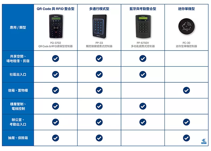 勾選 3~4 項:推薦進階型如 PP-33 或 PQ-3702,可滿足 RFID門禁系統、遠端管理、智能門禁與樓層管制等應用。